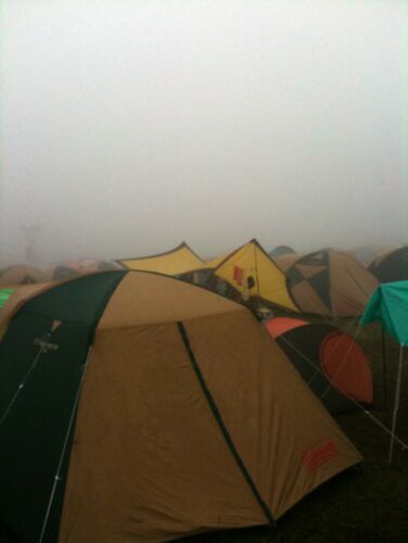 「すごい! いや、それほどでもないけど、でもすげーよ!」という声で目が覚める。雨の音がしない! と思ってテントをはいでると、外真っ白、だけど雨が止んでいた。 太陽が顔を見せるたびにあたりのテントから大歓声。朝霧に行くたび、太陽ってありがたいな…